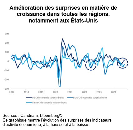 Les investisseurs en actions se sont eux aussi empressés d'intégrer ces bonnes nouvelles dans les valorisations et les prévisions. Après 5 semaines de hausse consécutives – sa plus longue série de gains cette année –, l'indice S&P500 vient de dépasser le seuil de 5 800 points. Cette envolée a indiscutablement été soutenue par l'augmentation des bénéfices : la croissance s’est avérée plus forte que prévu aux États-Unis et devrait bénéficier d'un nouveau soutien budgétaire et monétaire en Chine, mais aussi d'une politique monétaire moins restrictive en Europe.