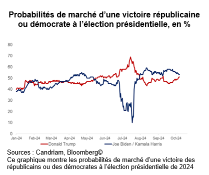 À ce stade, les investisseurs semblent se concentrer sur l'amélioration des fondamentaux et ignorer quelque peu l'élection américaine. Selon les probabilités de marché, les deux candidats sont désormais au coude à coude.