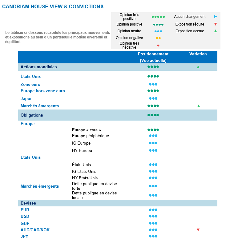 Compte tenu de l'amélioration des fondamentaux et de l'assouplissement des conditions financières, qui soutiennent l'activité et les marchés, nous sommes devenus plus confiants ces dernières semaines et surpondérons désormais les actions. Nous avons notamment renforcé notre allocation en écho à l’évolution des contextes économiques américain et chinois. Afin de tirer parti de la dynamique actuelle, nous sommes tactiquement positifs sur la Chine et sur l’ensemble des marchés émergents.