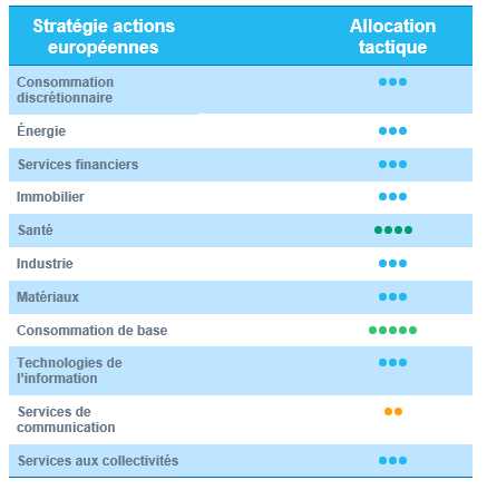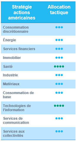 Nous n'avons apporté aucun changement stratégique majeur le mois dernier. Nous restons convaincus que la prudence s’impose vis-à-vis des secteurs cycliques, comme en témoigne notre position neutre envers l’industrie et la consommation discrétionnaire, et qu’il convient de privilégier les secteurs défensifs.