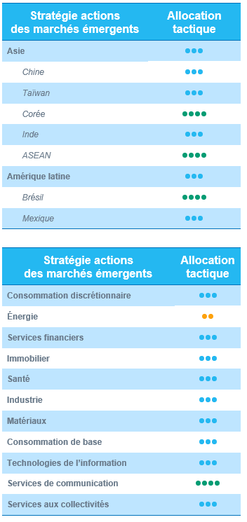 Nous relevons la note de la Corée du Sud de 0 à +1, tout en maintenant une surpondération sélective de l'ASEAN et du Brésil (Amérique latine).