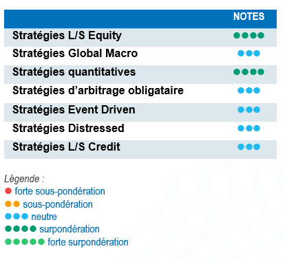 Les taux d'intérêt de base restent élevés, offrant aux investisseurs en crédit des rendements satisfaisants. Cependant, les spreads des obligations d’entreprise sont proches de planchers historiques. On peut dès lors se demander si les investisseurs sont correctement rémunérés pour le risque qu’ils assument. Les gérants ont concentré les portefeuilles sur leurs convictions les plus solides en matière de fondamentaux, augmenté le niveau des couvertures et réduit l’orientation directionnelle des stratégies. Parallèlement, le niveau élevé des valorisations génère de nombreuses opportunités pour les stratégies d’alpha fondées sur des positions short. Bien que les taux entament un cycle de baisse, ils restent à des niveaux élevés, ce qui favorise la génération d'alpha à la fois sur les positions longues et shorts, la recherche fondamentale devenant plus importante dans la construction des portefeuilles. Les approches de performance absolue ou d’investissement couvert ont gagné en pertinence avec l'augmentation des risques idiosyncratiques et la montée de l'incertitude géopolitique. La diversification des risques demeure essentielle et devrait faire partie intégrante du processus d’allocation des investissements.