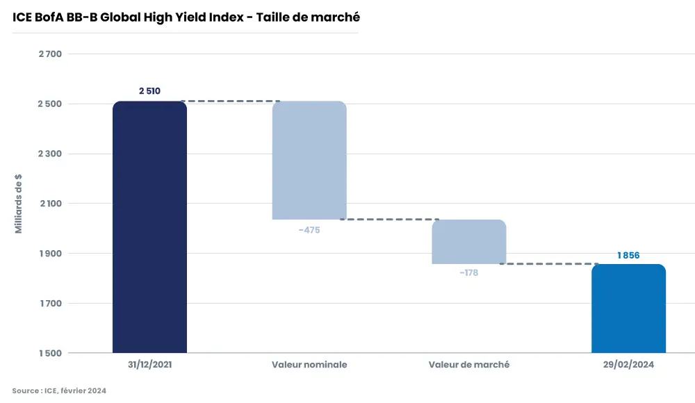 [1] Source : Bloomberg©, ICEBofA BB-B Global High Yield Index (HW40) en USD, entre fin 2021 et février 2024