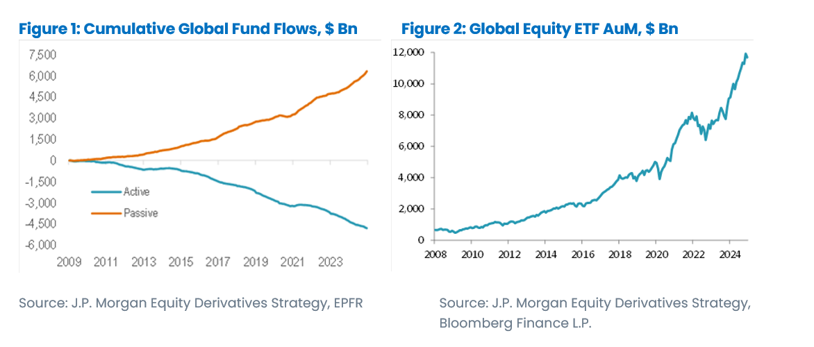 Il 2024 è stato un altro anno record per il settore passivo, con una forte crescita degli asset che ha superato il record del 2021. Inoltre, il 2024 ha segnato una pietra miliare significativa, poiché gli asset in gestione (AuM) gestiti passivamente hanno superato quelli gestiti attivamente, come risultato di diversi anni di afflussi per i primi e di deflussi per i secondi.