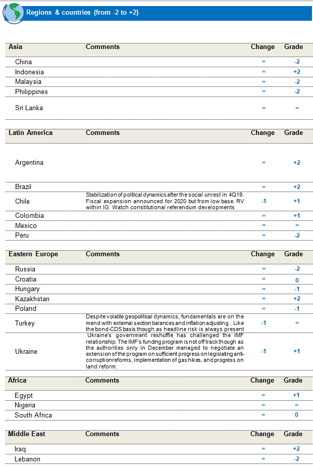 We partially covered the mid-20s underweight in Lebanon just before the country officially defaulted on its $1.2bn March 9th debt maturity. We expect recovery values of around 35 as Lebanon will require deep haircuts to restore debt sustainability from its current public-debt-to-GDP level of 170%. As we expect a prolonged debt-restructuring process that may create opportunities for better entry points, we are staying on the sidelines for the moment.