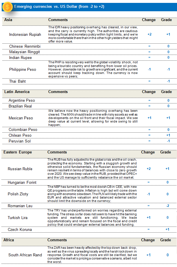 We outperformed the benchmark by 8bps on a net basis. Starting the month, we added to high-beta FX short to hedge our residual OW position, which was not proving easy to sell (Ukraine, Dominican Republic) and took profits after the Fed and ECB announced unlimited QE. Mid-month, we added to duration in US Treasuries and high-yielders (Brazil, South Africa, Russia), later taking some profits. We remain cautious in the medium term, as the lockdown measures take their toll on growth and fiscal balances.