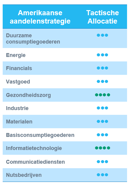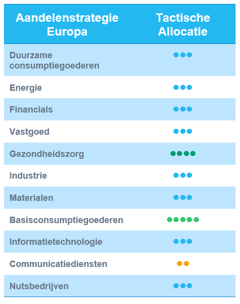 We hebben de afgelopen maand geen belangrijke strategische veranderingen doorgevoerd. We blijven ervan overtuigd dat het verstandig is om een voorzichtige positie in te nemen in meer cyclische sectoren, wat tot uitdrukking komt in onze neutrale beoordeling van onder andere duurzame consumptie en industrials, en een voorkeur voor defensieve sectoren.