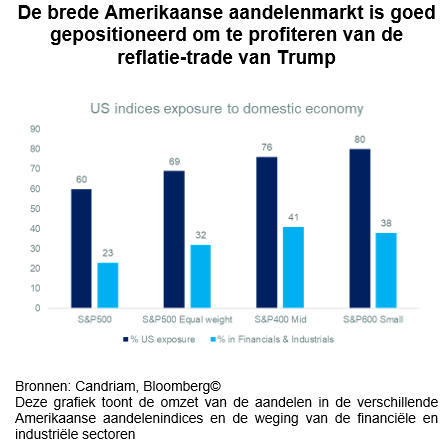 - We hebben een overwogen positie in de brede markt van Amerikaanse aandelen, inclusief small-cap aandelen en sectoren die zouden profiteren van een sterkere bbp-groei en stimulusbeleid. Financiële aandelen zullen naar verwachting profiteren van de deregulering, waarbij banken 20% van de small-cap index uitmaken, terwijl we verwachten dat Software en diensten superieur zullen presteren.