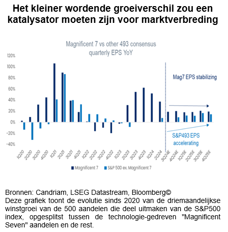 Volgens de consensusvoorspellingen zal dit naar beneden doorsijpelen en de winstgroei van de Amerikaanse bedrijven ondersteunen. In tegenstelling tot de afgelopen twee jaar zal de overgrote meerderheid van de aandelen in de VS opnieuw profiteren van een totale winstgroei - een voorrecht dat voorheen beperkt was tot de meest dynamische, technologie-gedreven "Magnificent Seven" aandelen. Als gevolg hiervan zou de verwachte verkleining van het verschil in winstgroei de hele Amerikaanse aandelenmarkt moeten ondersteunen.
