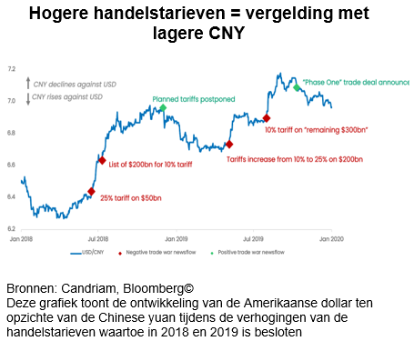 De voortdurende devaluatie van de CNY in het vierde kwartaal heeft bredere gevolgen voor de wereldeconomie: ze heeft geleid tot meer volatiliteit op de valutamarkten, kan de handelsbalansen beïnvloeden als de zwakte aanhoudt en kan de winstgevendheid van multinationals met blootstelling aan China beïnvloeden. Daarnaast kan een zwakkere CNY bijdragen aan de wereldwijde desinflatoire druk, omdat goedkopere Chinese goederen het algemene prijsniveau verlagen. Tijdens de eerste termijn van Donald Trump als president van de VS was dit de reactie van de Chinese autoriteiten en het gebruik van dit instrument is onlangs door de autoriteiten bevestigd als er nieuwe tarieven zouden worden opgelegd op Chinese goederen.