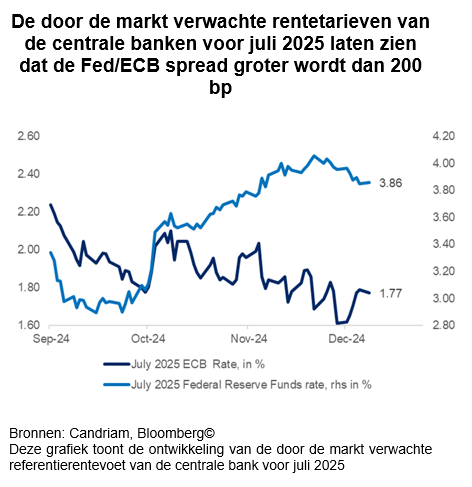 De door de markt verwachte rentetarieven van de centrale banken voor juli 2025 laten zien dat de spread tussen de Federal Reserve (Fed) en de Europese Centrale Bank (ECB) groter wordt dan 200 basispunten (van 140 basispunten). Deze toenemende spread weerspiegelt al de uiteenlopende monetaire beleidspaden van de twee centrale banken. Aan de ene kant wordt verwacht dat de Fed haar expansie-cyclus zal pauzeren en de rente op een niveau zal houden om de inflatie te bestrijden. Aan de andere kant zal de ECB waarschijnlijk een meer versoepelende houding aannemen om de economische groei in de eurozone te ondersteunen.
