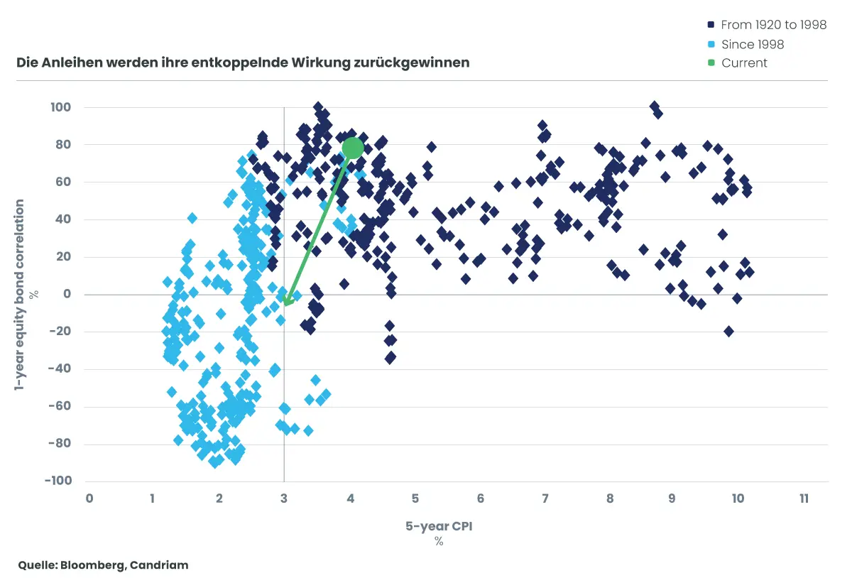Die positive Korrelation zwischen Aktien und Anleihen in den letzten Jahren hat die Verwaltung diversifizierter Portfolios erschwert, da sich die Kurse der beiden großen Anlageklassen in dieselbe Richtung bewegten. Zinserhöhungen führten zu Rückgängen an den Aktienmärkten und bei den Anleihekursen, während die Aktien- und Anleihemärkte bei einer Lockerung der langfristigen Zinsen eine positive Entwicklung verzeichnen konnten. Unsere quantitative Analyse zeigt, dass dies historisch gesehen der Fall ist, wenn die Inflation 3 % übersteigt, was seit dem Ende von Covid der Fall war. Unterhalb dieser Schwelle von 3 % kann die Korrelation zwischen Aktien und Anleihen sinken und wieder negativ werden, was eine wirksame Diversifizierung zwischen Aktien und Anleihen ermöglicht. In unseren Wirtschaftsprognosen gehen wir davon aus, dass das Niveau von 3 % in den Vereinigten Staaten bis 2025 unterschritten wird.
