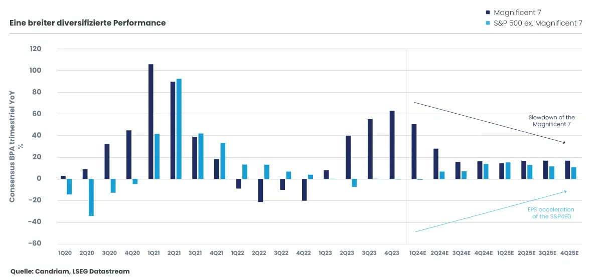 Auf dem US-Markt bleiben wir positiv gegenüber dem Technologiesektor eingestellt, der weiterhin ein starkes Gewinn- und Cashflow-Wachstum verzeichnen dürfte. Nach vier Quartalen der Dominanz der „Magnificant 7“ (über 40 % Gewinnsteigerung, vor allem durch Nvidia[8]) werden die anderen 493 S&P500-Unternehmen voraussichtlich ein positives Gewinnwachstum erzielen und zu den Megacaps aufschließen. Bei dieser Hypothese wäre der Anstieg der Finanzmärkte gesünder, da er von der positiven Entwicklung einer größeren Anzahl von Aktien getragen würde.
