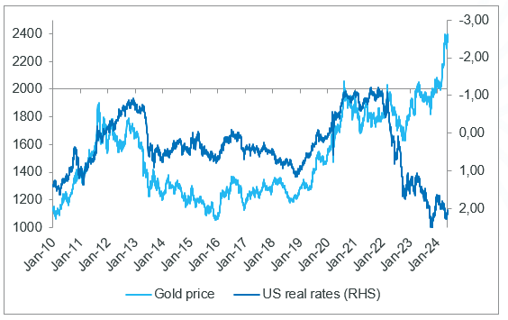 Wir rechnen mit einem etwas günstigeren makroökonomischen Umfeld. Die Realzinsen dürften bestenfalls stabil bleiben oder angesichts der Konjunkturabschwächung und der ersten Zinssenkungen der Fed sogar leicht fallen, was den Goldpreis stützen dürfte. Man könnte hinzufügen, dass das Risiko einer Rückkehr der Inflation im umgekehrten Fall auch für Gold günstig ist (als Realwert schützt es vor übermäßiger Inflation).