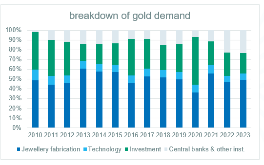 Die weltweite Goldnachfrage der Zentralbanken hat sich seit 2022 verdoppelt und ist von 11 % der gesamten Goldnachfrage im Jahr 2021 auf 23 % im Jahr 2023 gestiegen. Dieser Trend setzte sich im ersten Quartal dieses Jahres fort. Die Anlagen (Goldbarren und -münzen, börsengehandelte Fonds), die im Jahr 2020 (dem Covid-Jahr) stark angestiegen waren, sind seitdem stark gefallen. China ist der größte Goldproduzent der Welt (10 % der Minenproduktion), aber auch der größte Goldimporteur der Welt (20 % der Goldnachfrage). Die PBOC hat ihre Goldreserven in den Jahren 2022-2023 aufgestockt, wobei der Gesamtbetrag ungewiss bleibt, da sie nicht verpflichtet ist, alle ihre Goldkäufe transparent zu veröffentlichen. Auch die chinesischen Verbraucher scheinen einen Teil ihrer Ersparnisse in Goldkäufe gesteckt zu haben, ohne dass der Betrag genau feststeht.