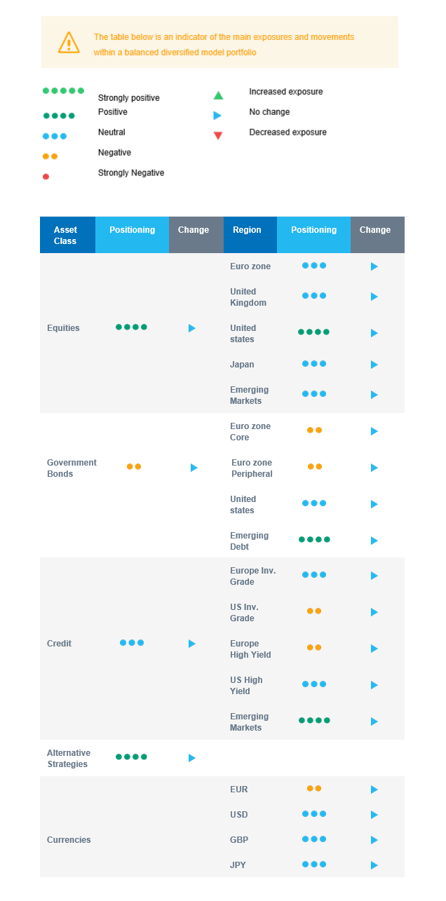Global economic growth and inflation keep slowing down, but we now start to have positive surprises on growth and less upward surprises on inflation than at the beginning of the year. We therefore tactically added to equities via the US and the euro zone to become slightly overweight. Regionally, our preferences go to Emerging markets and the US. On the fixed income side, we keep a slight short portfolio duration and upgraded our stance on US high yield debt to lock in an attractive carry. The asset class looks attractive with a buffer for defaults as its carry to volatility relative to equities. We remain allocated to commodity currency via the CAD.
