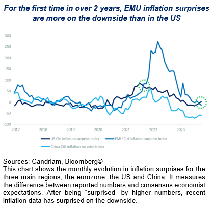 Europe remains in the worst fundamental situation, with economic and inflation data coming in below expectations, delivering negative surprises. At the start of Q4, not only do growth surprises in EMU remain clearly worse than in the US and in China, but inflation surprises have changed direction over the past year and are now below the surprise level registered in the US.