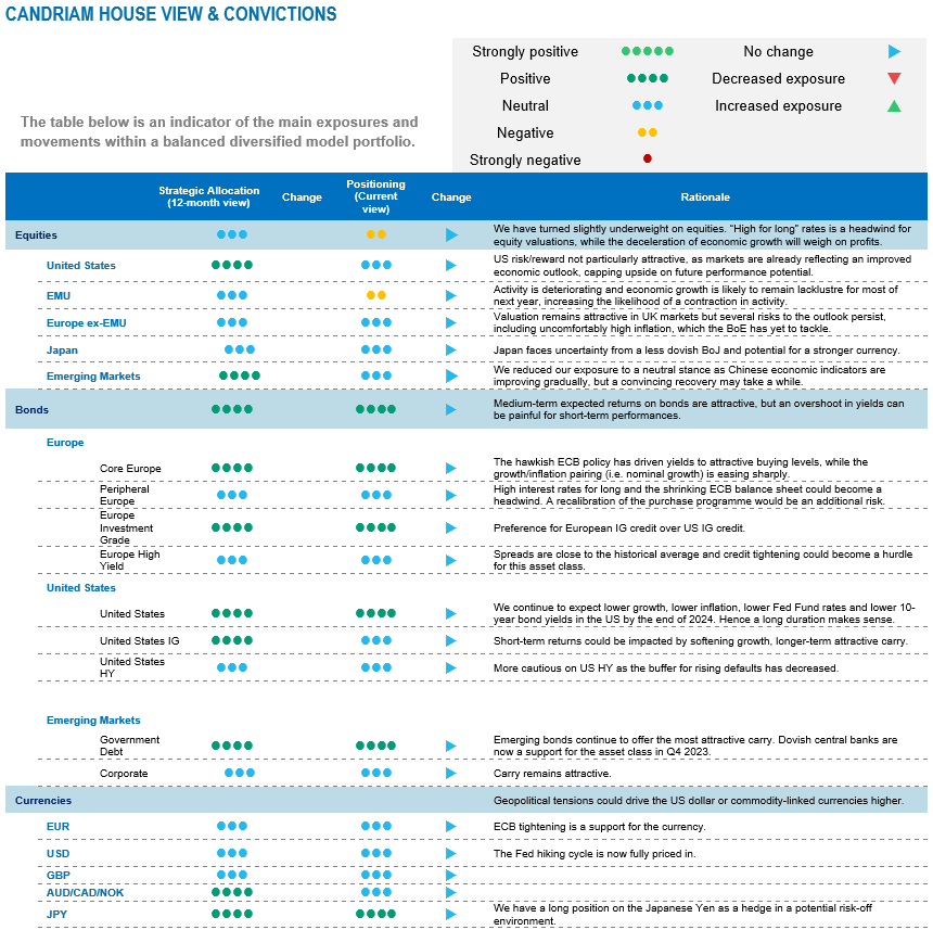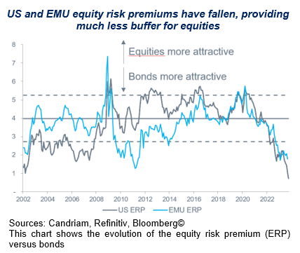 As a result, we are more confident in our asset allocation about extending duration if we believe that the peak in interest rates for the main central banks is behind us. On the credit side, we are positive on Investment Grade credit, which is a resilient asset class in a slowdown cycle and has one of the best carry-to-vol ratios. On the opposite, we consider that the equity risk premium is currently insufficiently attractive to encourage investors to reweight the asset class given the identified downside risks to our scenarios.