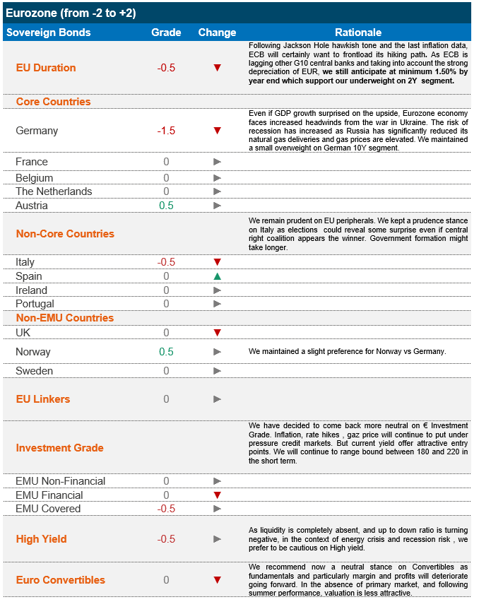 Commodity currencies again were the strongest outperformers vs. the EUR (CLP, RUB, MXN and BRL). The USD was up 2.83%. Relatively few major currencies ended the month softer against the EUR, but noteworthy among these were the JPY (-1.24%), HUF (-1.62%), GBP (-1.95%) and SEK (-3.51%). Fundamentally, our economic outlooks for both the US and Europe remain unchanged. We continue to believe it is more likely than not that the US can avoid a full-blown recession, although this remains a distinct possibility. In Europe, persistently high natural gas prices now appear to the most likely economic backdrop for the rest of the year and into 2023.