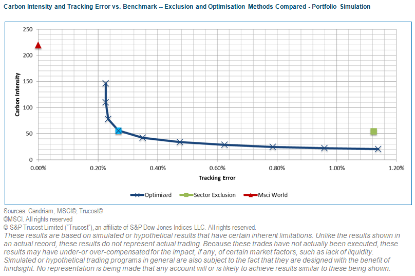 To assess the carbon Optimisation approach, we constructed a series of portfolio simulations with varying combinations of carbon intensity and tracking errors, shown as blue X's. The Optimisation portfolio within this series for which the carbon intensity is similar to that of the Exclusion approach is marked by the blue square: a 75% reduction in carbon intensity but with a significantly lower tracking error of 0.27%.