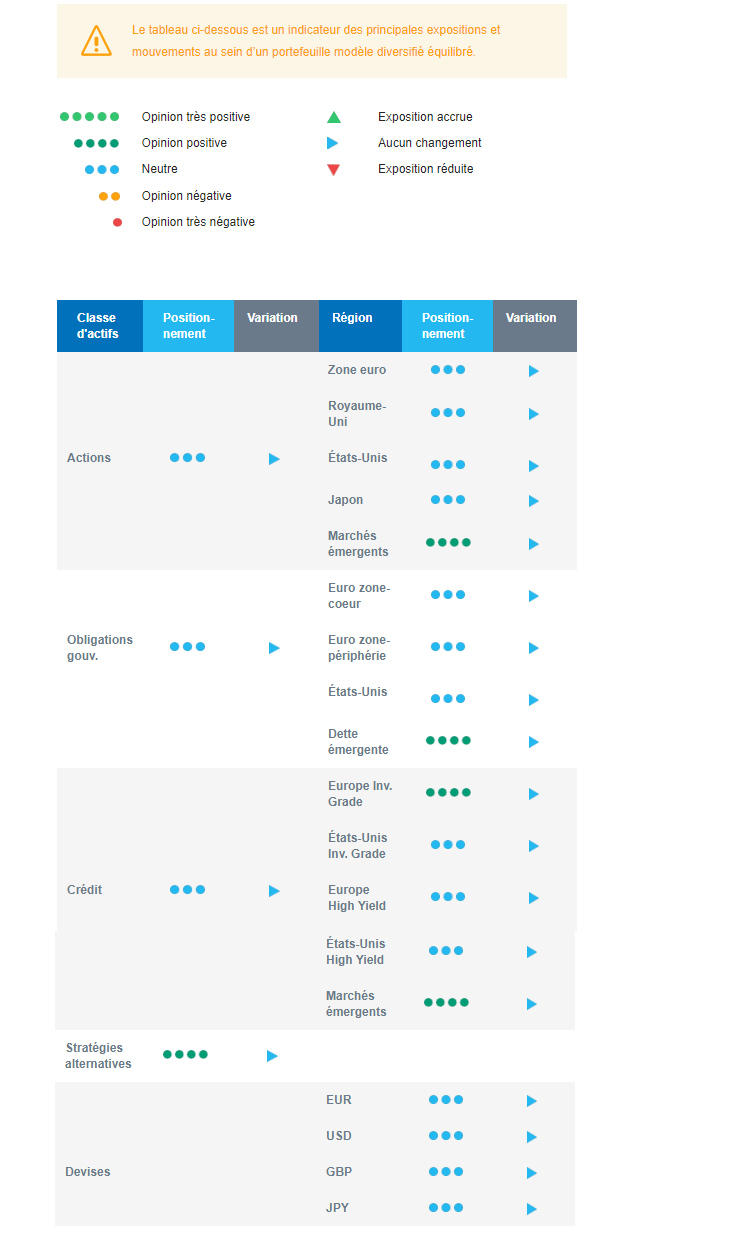 Our current positioning is neutral equities and neutral on bond duration, with a preference for Emerging markets. On the fixed income side, we have a constructive view on Investment Grade credit. In the context of robust growth and the reopening in China, we remain allocated to some commodities.