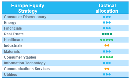 We have also maintained our positive (+2) rating on the Healthcare sector. European healthcare offers an attractive risk-return profile thanks to reasonable valuations, strong cash flow visibility, and projected earnings growth.