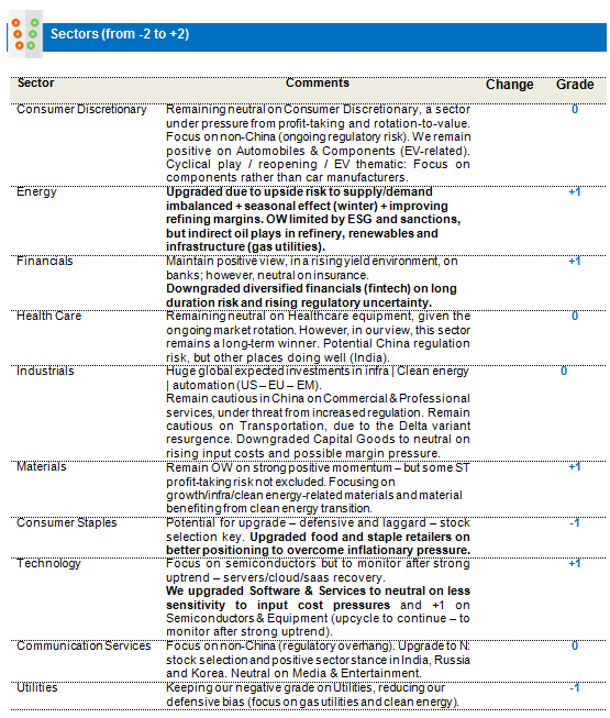 Real estate downgraded to negative (from 0 to -1): Downgrade driven in the sector by the large China real estate component, which is undergoing a regulatory overhaul and in which depressed sector sentiment is expected to linger for some time.