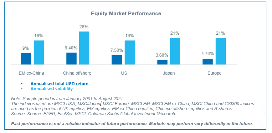 The risk of sanctions, tariffs and geopolitical tensions (such as those experienced by Russia and Russian companies) is also low for most EM ex-China equities. Taken together, this makes EM ex-China equities less volatile over the long term, as the study below shows, and an obvious alternative for investors with a low risk appetite.