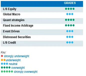 Macro strategies averaged modest but positive returns during October. The main performance drivers were short positions in equities, the long on the US dollar and the long on a selective number of commodities. Currently, Global Macro strategies tend to be diversified, holding a wide variety of small bets across equities, rates, currencies and commodities, rather than concentrating their portfolio in just a couple of high conviction trades. Returns generated by macro strategies since the start of the year have been relatively muted and below expectations. However, the current and foreseeable environment is expected to offer interesting investment opportunities.