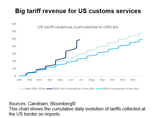 - The implementation of a new trade regime. Revenue collection at the border is rising sharply. The various hikes in sectoral and country-specific trade tariffs since Inauguration Day in January is are now reflected in customs revenues. As of the end of June, US Treasury data shows that this year’s revenue has already surpassed the total collected by US customs during the whole of 2024. Ahead of anticipated tariffs to be implemented next August, the latest annualised monthly revenue now exceeds USD 300bn – a partial but significant source of funding for the costly fiscal package, dubbed the “One Big Beautiful Bill Act” (OBBBA).