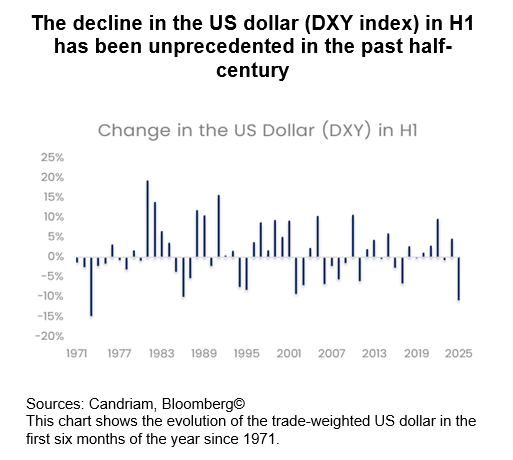 - The US dollar recorded its worst first-half performance since 1973. This striking outcome reflects the shift in US economic policy under the new administration - one clear consequence of which has been a pronounced weakening of the dollar. Notably, a weaker currency was one of Trump’s stated campaign objectives. The dollar had remained too strong for too long, making American goods less competitive abroad while encouraging cheap imports. That trend has now reversed. In many respects, the dollar’s decline can be seen as a policy success: it enhances the global price competitiveness of U.S. exports