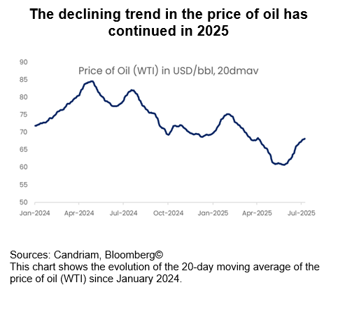 - Oil prices are trending lower. Another stated campaign goal was to bring down oil prices. This aim has also been achieved, and consumer and production prices have been trending lower in the first half of the year, supporting consumption and economic activity. Notably, the decline in oil prices has resulted from higher output by OPEC+ countries rather than a rise in US drilling. In this context, it is worth noting that President Trump’s first major international trip of his second term included visits to Saudi Arabia, Qatar, and the United Arab Emirates.