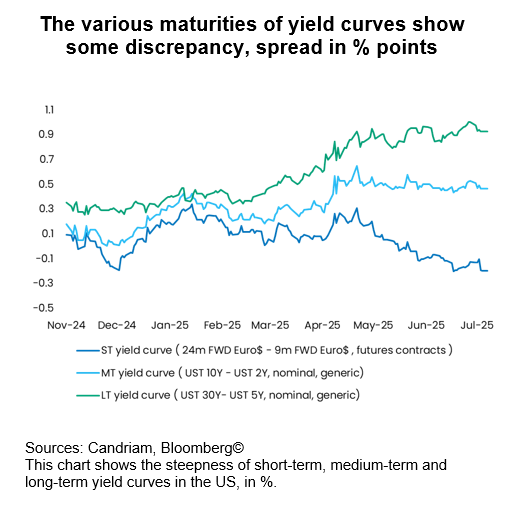 - Rate expectations vs. central bank posture: In the U.S. and Europe, policy expectations are more dovish than policymakers themselves. Real yields have softened, breakeven rates remain well-anchored, and volatility is subdued. However, this market calm masks an environment where the Fed is under political pressure and the ECB is navigating both a slowing economy and fiscal expansion in Germany. We note that market expectations of a Fed rate cut in the foreseeable future have led to an inverted short-term yield curve, which has clearly diverged from the rest of the curve. Beyond the Fed and ECB meetings at the end of July, investors should analyse the outcomes of the Central Bank and Economic Policy Symposium in Jackson Hole in August.