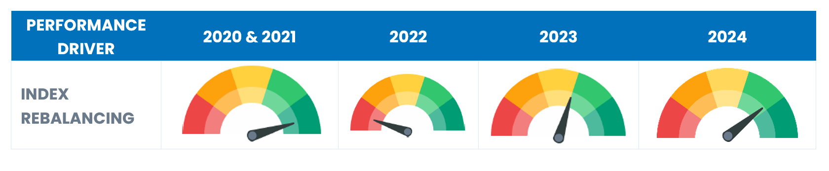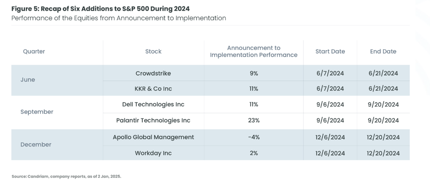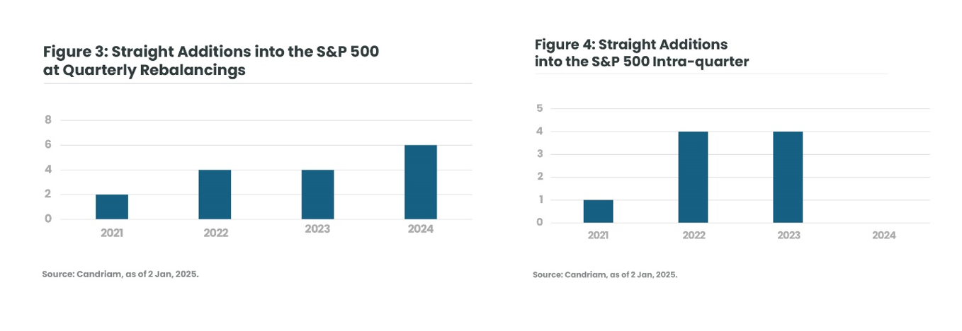 The latter part of 2024, and the year as a whole, saw our index rebalancing strategy perform well. In the second half, performance was mostly driven by the quarterly rebalancings, which saw very large turnover. Indeed, on the back of two consecutive years of AI-driven bull markets with fewer M&A transactions closing, this year has also seen a significant number of straight additions into the S&P 500 at quarterly events with no intra-quarter adjustments.