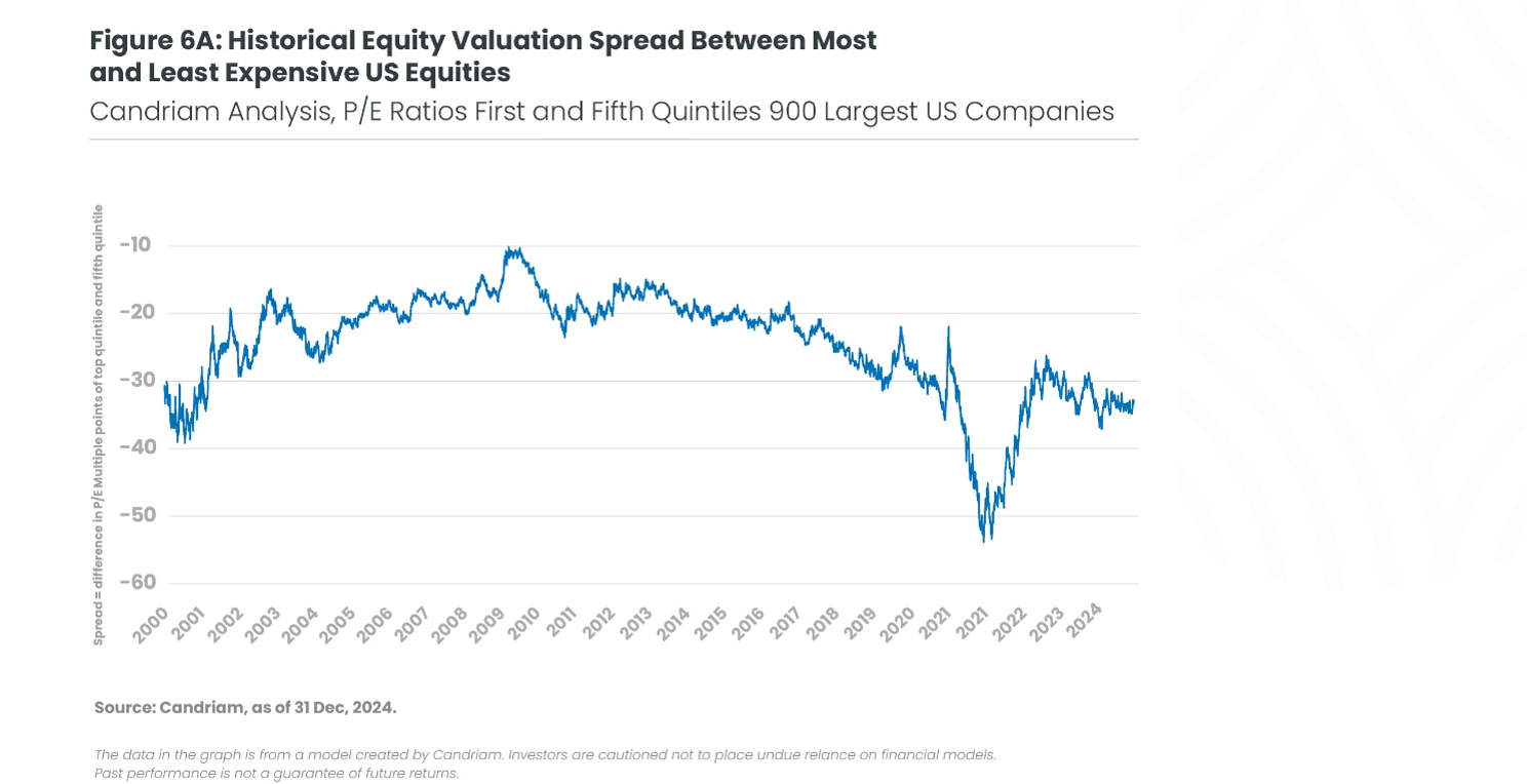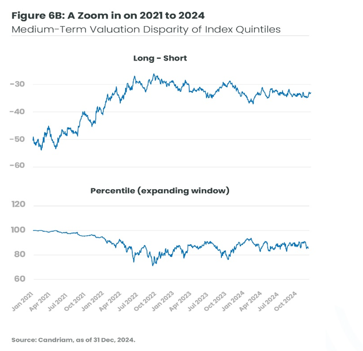 As Figure 6B shows, there was a widening in valuation spreads in early 2024, both in June and in late December. On many occasions spreads hit the 90th percentile bar, indicating historically large distortions.