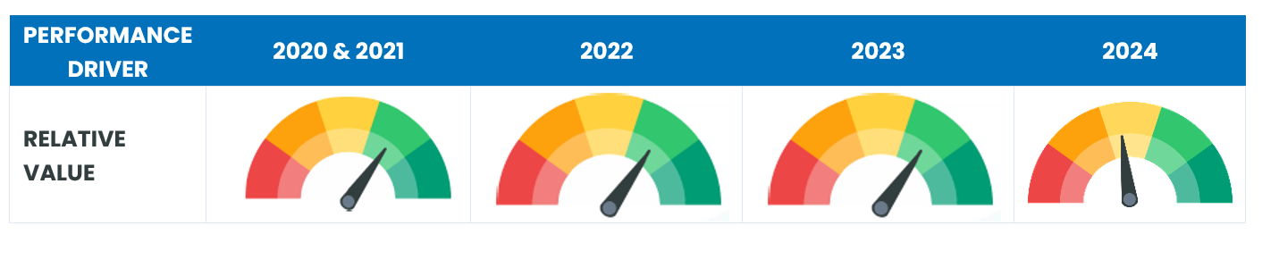 Following the record high spreads of 2021 and through late 2023, there has been significant narrowing in spreads in the study universe. During those two years, our relative value strategies contributed positively to the performance of our EMN strategy.