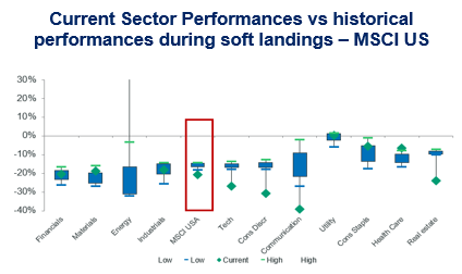 We note that, performance-wise, US indices are pricing more than a soft landing. Current performances of long duration sectors are indeed way below a soft-landing scenario, while most sectors integrate a severe deterioration. The (logical) exception to this panorama is the Energy sector, which is far from pricing a soft landing.