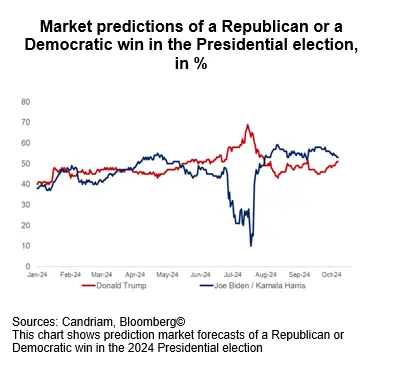 Of note, investors appear to have sidelined the US election and be concentrating on improving fundamentals for now. We observe that prediction markets have tightened, showing the two camps almost level.
