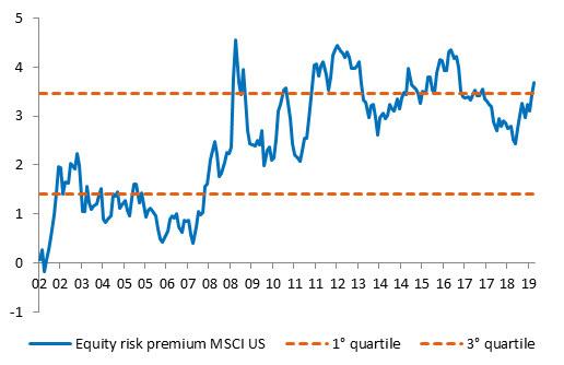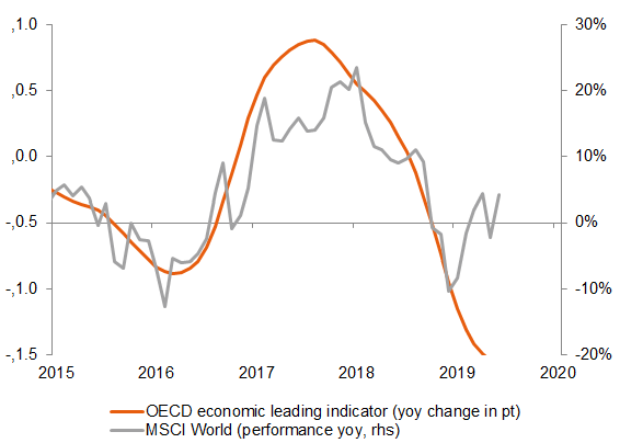 Although a recession remains unlikely over the next few months, should we be concerned over the current valuation of risky assets? Trading multiples among equities have risen since the beginning of 2019, but remain close to their long-term average. The sharp fall in sovereign yields since the beginning of the year has rendered equities increasingly attractive in relative terms. Investors seeking yield and returns are obliged to continue taking risks. This argument is currently the strongest rationale in favour of the bullish trend continuing. It nonetheless clearly represents a danger if there is no convincing improvement in economic fundamentals.