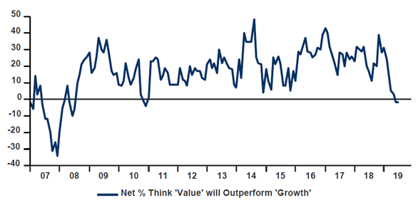 Any capitulation or justification based on the theme of a “new paradigm”, or a “new era” or “things have changed and will never be the same as before” may be considered as relatively clear signals of excess. This is the case with interest rates today. As investors, we are all convinced that we shall have to continue navigating in a low interest rate environment for the foreseeable future, with durably weak inflation and central banks remaining accommodating for the long term. The consequences of this new normality are reflected in the positive performances returned by fixed-income asset classes, as investors search desperately for yield, and also in the historically wide performance gap between growth and value stocks. Furthermore, investors have partially capitulated on this point, as the latest BofA Merrill Lynch Global fund manager survey in chart 3 illustrates.