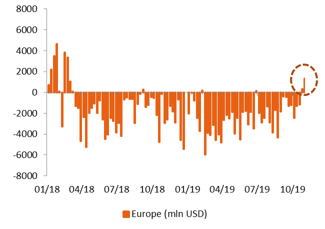 After the shift towards a pro-Euro government in Italy, the (likely) Brexit resolution means that political risk in Europe has fallen. Looking forward, this means that two major potential growth shocks have virtually disappeared, making investments for non-European investors more attractive. In addition, investors appear to be under-allocated to the UK. The recent inflows registers by Pan-European mutual funds are a confirmation of this view.
