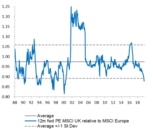 Further, we see attractive relative valuations, which already discount the impact of Brexit. In particular, the negative impact of the no-deal menace during the summer months has pushed relative valuations of the UK market below one standard-deviation of its long-term average vs. the broad European equity universe.