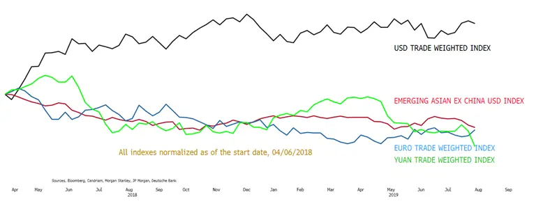 The strong dollar is driven, among other things, by greater growth momentum in the US than in Europe and ASEAN. The US-China trade war has weakened a Chinese economy already rocked to the core and competing with countries like Germany and South Korea, for which globalisation is a godsend. Result: since the start of the trade war with China, the USD has strengthened against most other currencies, in particular the euro and emerging Asian currencies, as shown in the graph below, which compares changes in the trade-weighted indices of the aforementioned currencies. Regardless, the sitting president has recently shown – via recent customs tariff hikes – how serious he is about upping the ante. Another reason quoted is the rate spread, especially compared with Europe and Japan. Sure, the Fed did cut its rate in July by 25bps, but Powell’s speech was considered dovish. The reduction must also be weighed against the imminent decisions of the other central banks, in particular the ECB. This has led to Trump training his ire against the issuing institution, accusing it of incompetence . If the Fed remains reactive or proves slow in meeting market expectations, the US dollar could remain strong.How can Trump cut the rate?