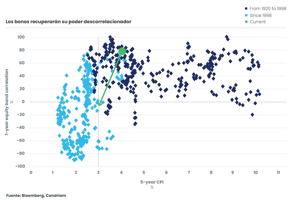 La correlación positiva entre la renta variable y la renta fija en los últimos años ha complicado la gestión de carteras diversificadas, ya que los precios de ambas clases de activos se mueven en la misma dirección. Las subidas de tipos provocaron caídas en los mercados de renta variable y en los precios de la renta fija, mientras que la relajación de los tipos a largo plazo permitió a los mercados de renta variable y renta fija registrar resultados positivos. Nuestro análisis cuantitativo muestra que esto ocurre históricamente cuando la inflación supera el 3 %, lo que ha sido el caso desde el final de la Covid. Por debajo de este umbral del 3 %, la correlación entre la renta variable y la renta fija puede disminuir y volver a ser negativa, lo que permite una diversificación eficaz entre la renta variable y la renta fija. Según nuestras previsiones económicas, en Estados Unidos caerá por debajo de este nivel del 3% en 2025.
