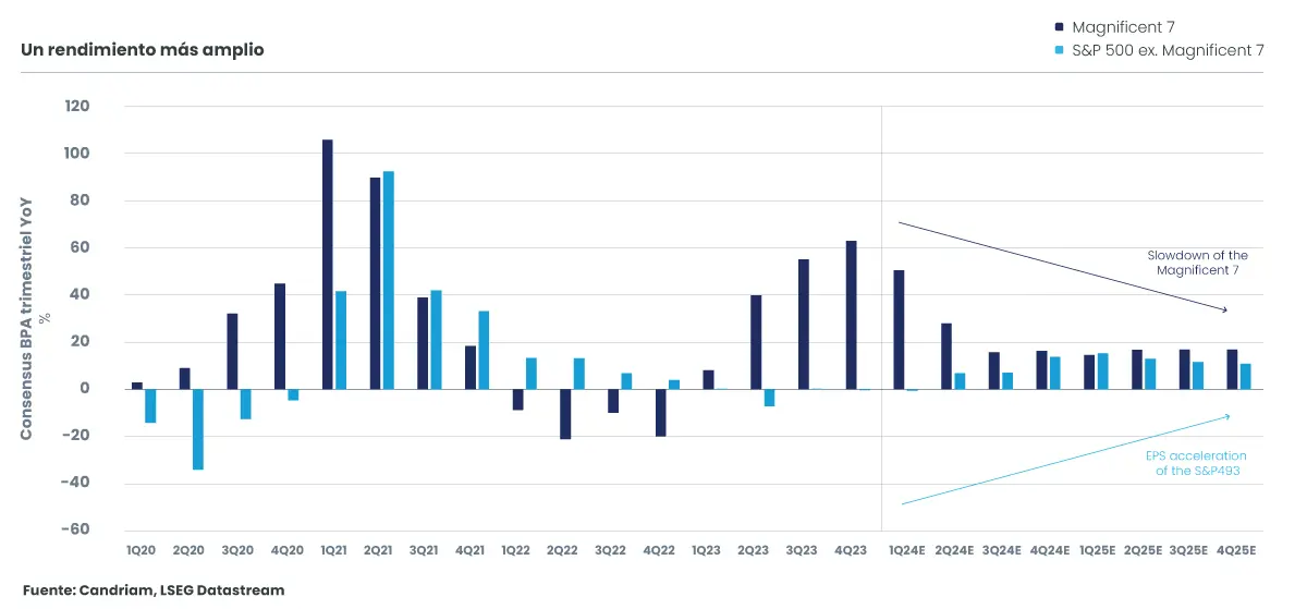 En el mercado estadounidense, seguimos siendo positivos en el sector tecnológico, que debería seguir disfrutando de un fuerte crecimiento de los beneficios y del flujo de caja. Tras 4 trimestres de dominio de las 7 magníficas (más de un 40 % de aumento de los beneficios, impulsado en gran medida por Nvidia[8]), se prevé que las otras 493 empresas del S&P500 registren un crecimiento positivo de los beneficios y acorten distancias con las megacaps. En esta hipótesis, la subida de los mercados financieros sería más saludable, ya que estaría impulsada por el comportamiento positivo de un mayor número de valores.