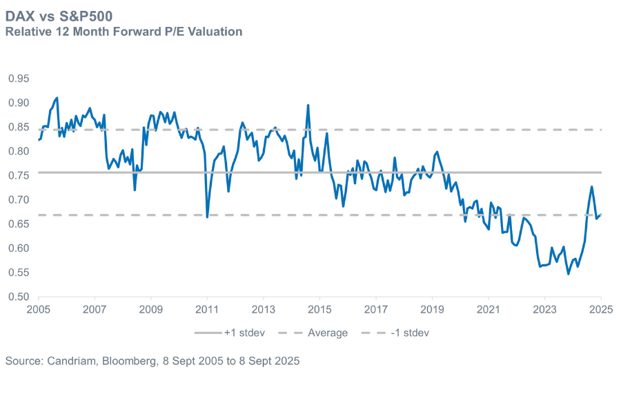 El primero es el giro fiscal-industrial de Alemania. Los titulares se han enfriado, pero el fondo se ha profundizado. La comisión presupuestaria de Berlín ha avanzado un presupuesto para 2025 cargado de inversiones, con una inversión pública récord y una clara priorización de la defensa. La clave está en la ejecución: supervisar la aprobación del presupuesto, los procedimientos de adjudicación de contratos y el boletín mensual del Ministerio de Hacienda como indicadores de alta frecuencia de la ejecución. Para los inversores en renta variable, la lección es sencilla: el tema no murió cuando lo hicieron los titulares. El posicionamiento de los inversores se ha reajustado[4]; la cadencia de pedidos debería acelerarse en los próximos meses ; y los retrocesos de los proveedores alemanes de infraestructuras y defensa siguen desvelando atractivos puntos de entrada. El DAX tiene un PER de alrededor de 15 y sigue cotizando aproximadamente una desviación típica por debajo de su media histórica en relación con el estadounidense[5] (véase el gráfico). Las métricas ajustadas al crecimiento apoyan el margen para una nueva revalorización dada la aceleración prevista de los beneficios en los próximos dos años[6]