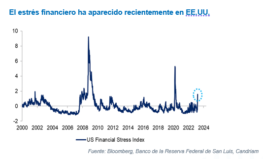 La perspectiva de un crecimiento económico lento tanto en EE.UU. como en la zona euro sigue siendo nuestro escenario más probable. Sin embargo, reconocemos que el riesgo de una situación más difícil ha aumentado: es probable que las turbulencias bancarias conduzcan a un mayor endurecimiento de las condiciones financieras.