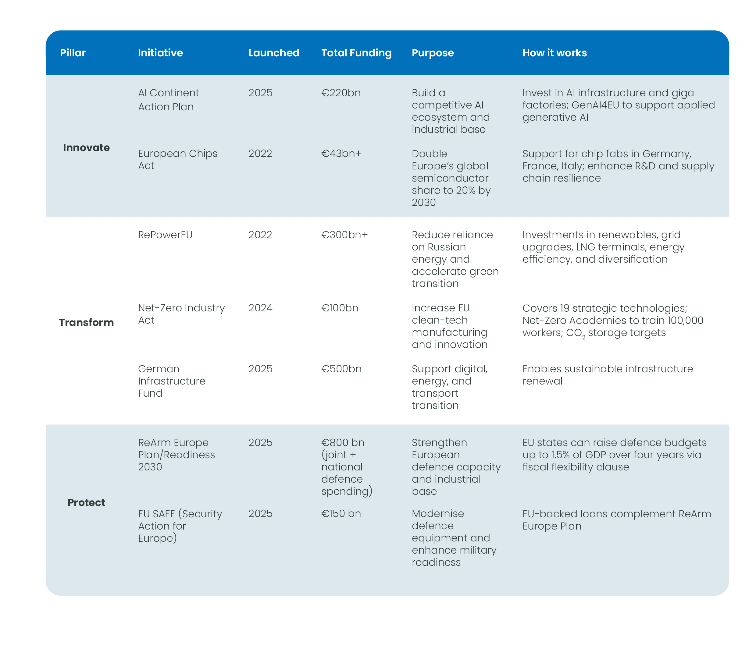 - Other initiatives (such as ReArm Europe and the Infrastructure Fund) remain in early stages of planning and mobilisation, with full implementation and large-scale spending still ahead. Nevertheless, progress is solid, with the €150 billion SAFE Plan already fully subscribed by 19 member states.[7]