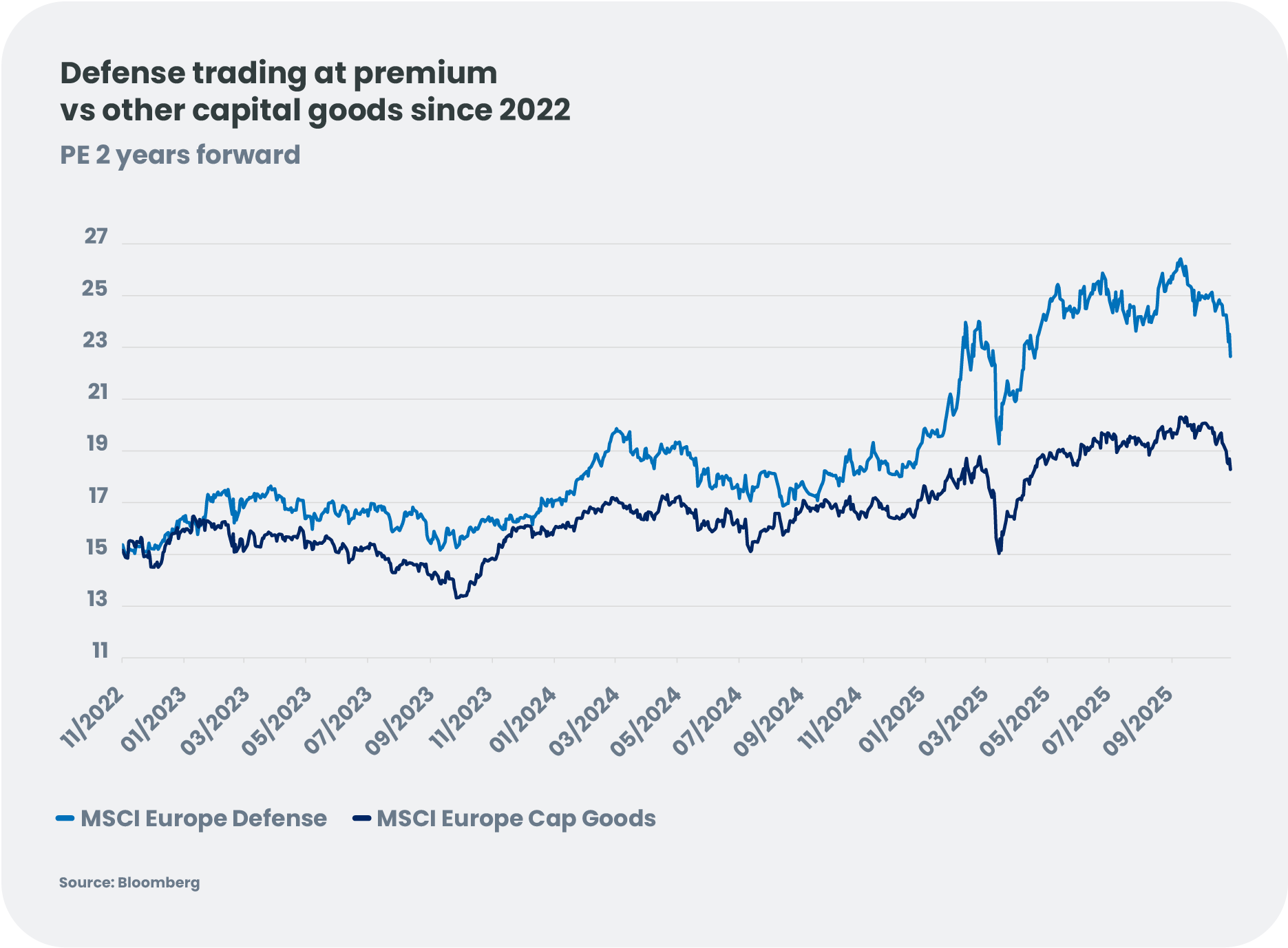 - Aerospace and defence: Valuation levels are normalising after strong performance and progress in Russia–Ukraine peace talks, creating new investment openings. Spending is expected to hold firm given the persistent Russian threat and the need to rebuild key capabilities. We favour exposure to German defence budgets and companies with promising valuation levels. We also monitor the shift toward long-cycle defence and upcoming IPOs.