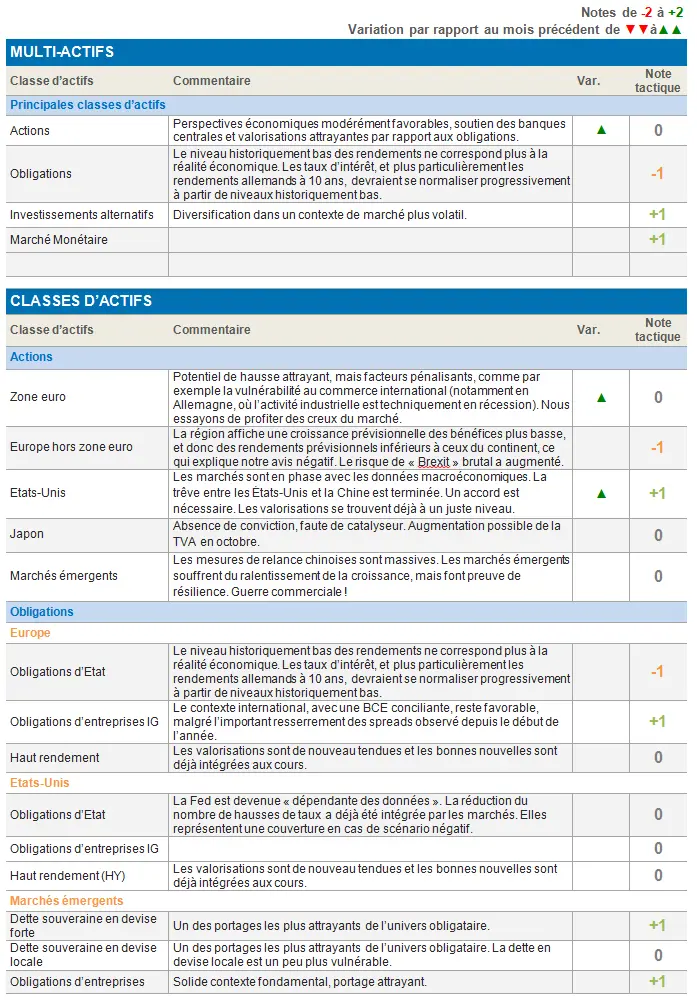 En juillet, les marchés ont consolidé leur solide performance du premier semestre 2019. Soutenues par des résultats trimestriels satisfaisants et la perspective d’une baisse des taux de la Fed, les actions américaines ont dominé le mouvement. Sachant que les cours reflétaient déjà la baisse attendue des taux et que les tensions commerciales pouvaient se raviver, nous avions décidé dès juillet de réduire notre exposition aux actions. Début août, les marchés ont déjà commencé sur une fausse note, la Fed donnant l’impression de ne pas être suffisamment conciliante avec une hausse de 25 points de base et l’indication que cela ne constituait pas le début d’un nouveau cycle d’assouplissement, tandis que Donald Trump annonçait de nouveaux droits de douane sur les produits chinois. Mais tant qu’une récession n’est pas en vue, les investisseurs continueront d’être attirés par les actifs risqués, ce qui suffit à justifier, de notre point de vue, des achats en période de baisse……« buy the dips » .